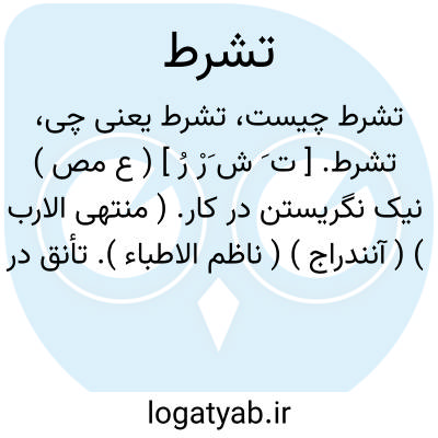 تشرط. [ ت َ ش َرْ رُ ] ( ع مص ) نیک نگریستن در کار. ( منتهی الارب ) ( آنندراج ) ( ناظم الاطباء ). تأنق در عمل. ( از اقرب الموارد ). || بتکلف پذیرفتن شروطی را که بزیان او باشد. ( از اقرب الموارد ).