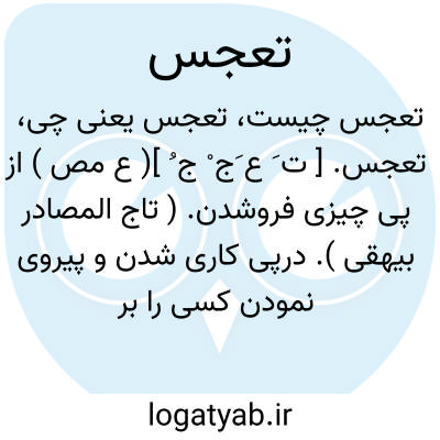 تعجس. [ ت َ ع َج ْ ج ُ ]( ع مص ) از پی چیزی فروشدن. ( تاج المصادر بیهقی ). درپی کاری شدن و پیروی نمودن کسی را بر کاری. ( منتهی الارب ) ( ناظم الاطباء ). پیجویی و تعقیب کار کسی. ( از اقرب الموارد ). || پی هم باریدن باران. ( منتهی الارب ) ( ناظم الاطباء ) ( از اقرب الموارد ). || بند کردن و بازداشتن و یعدی بالباء. ( منتهی الارب ) ( ناظم الاطباء ). بازداشتن و بتأخیر انداختن قوم را. ( از اقرب الموارد ). || در آخر شب برآمدن و رفتن. ( منتهی الارب ) ( ناظم الاطباء ). در ساعتی ازشب یا به هنگام سحر بیرون رفتن. ( از اقرب الموارد ). || درنگ نمودن و بازایستادن. || سرزنش نمودن کسی را. || تکبر کردن. ( منتهی الارب ) ( ناظم الاطباء ). || سپس انداختن کاری را و یقال: تعجسه ُ عرق سوء؛ ای قصر به عن المکارم. ( منتهی الارب ) ( ناظم الاطباء ) ( از اقرب الموارد ).