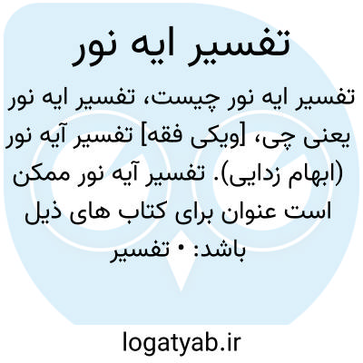 [ویکی فقه] تفسیر آیه نور (ابهام زدایی). تفسیر آیه نور ممکن است عنوان برای کتاب های ذیل باشد: • تفسیر آیه نور (دیلمانی)، اثر محمد شریف (زنده در ۱۱۰۰ ق) فرزند ابورضا دیلمانی از علمای عصر خویش• تفسیر آیه نور (تهرانی)، اثر شیخ هادی تهرانی (۱۲۵۳ - ۱۳۲۱ ق) فرزند محمدامین تهرانی نجفی، از علما و ائمه فتوی