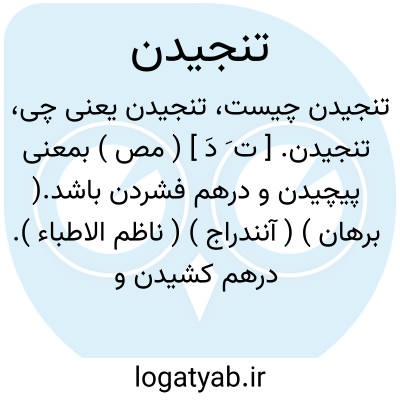 تنجیدن. [ ت َ دَ ] ( مص ) بمعنی پیچیدن و درهم فشردن باشد.( برهان ) ( آنندراج ) ( ناظم الاطباء ). درهم کشیدن و سخت وتنگ کشیدن. ( ناظم الاطباء ). شاید از ریشه تنگ بمعنی ضیق، ترنجیدن و درهم فشردن. سخت بستن. تنگ بستن. ( یادداشت به خط مرحوم دهخدا ). فراهم فشاردن. ( فرهنگ اسدی نخجوانی، یادداشت ایضاً ). پیچیدن و فراهم فشردن باشد. ( معیار جمالی چ دانشگاه ص 64 ). دکتر معین در حاشیه برهان آرد: تنجیدن بمعنی کشیدن و بستن و آشامیدن،اوستا «تنگ »، ( کشیدن ). استی «تین جین، ای تین جون »، ( پهن کردن ). بلوچی «تجنگ »، ( گستردن، کشیدن، توسعه یافتن ). انتقال معنی کشیدن به معنی نوشیدن در «آهنجیدن » و «کشیدن » دیده میشود. هوبشمان مصدر مزبور را از ریشه سانسکریت «تنک، تنج »، پراکریت «تنکتی »، ( کشیدن ) میداند. اسدی آورده است ترنج تنج باشد... ( برهان ج 1 ص 516 ):
