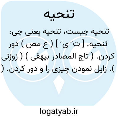 تنحیه. [ ت َ ی َ ] ( ع مص ) دور کردن. ( تاج المصادر بیهقی ) ( زوزنی ). زایل نمودن چیزی را و دور کردن. ( منتهی الارب ) ( آنندراج ) ( از اقرب الموارد ). یقال: نح الدمع عن خدک. ( اقرب الموارد ). زایل نمودن و یکسو نمودن. ( منتهی الارب در ذیل «ن ح و» ). ( ناظم الاطباء ). رجوع به تنحی شود.