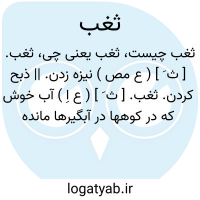 ثغب. [ ث َ غ َ ] ( ع اِ )آبگیر در سایه کوه که آب خنک و خوش دارد و آنرا سردابه گویند. بقیه آبی که در وادی بماند. ج، ثغاب.