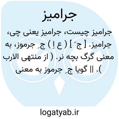 جرامیز. [ ج َ ] ( ع اِ ) ج ِ جرموز، به معنی گرگ بچه نر. ( از منتهی الارب ). || گویا ج ِ جرموز به معنی حوض کوچک است. حوضچه. ( منتهی الارب ) ( از معجم البلدان ). || اعضا. ( منتهی الارب ). اعضای انسان. ( معجم البلدان ). || حوض دوجانب برآورده. ( منتهی الارب ). حوضی که در زمین پست یا باغ بسازند چنانکه دو کرانه برآمده باشد. ( از اقرب الموارد ) || چاه. ( منتهی الارب ) ( اقرب الموارد ).