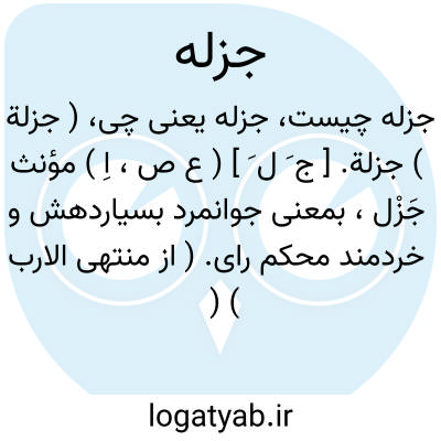 ( جزلة ) جزلة. [ ج َ ل َ ] ( ع ص، اِ ) مؤنث جَزْل، بمعنی جوانمرد بسیاردهش و خردمند محکم رای. ( از منتهی الارب ) ( از متن اللغة ) ( از ذیل اقرب الموارد ). || زن بزرگ سرین. ( منتهی الارب ) ( ناظم الاطباء ) ( از متن اللغة ) ( از ذیل اقرب الموارد ). سرین بزرگ از زنان. ( شرح قاموس ). || بقیه نان. ( منتهی الارب ) ( آنندراج ). بقیه ای از نان. ( ناظم الاطباء ). باقیمانده از گرده نان. ( از ذیل اقرب الموارد ) ( از متن اللغة ) ( شرح قاموس ). || مشک شیر. ( منتهی الارب ) ( آنندراج ) ( ناظم الاطباء ) ( اقرب الموارد ). باقیمانده در مشک شیر. ( از متن اللغة ) ( از ذیل اقرب الموارد ). مشک شیر و جلت. ( شرح قاموس ). || خنور ( ظرف ) خرما. ( منتهی الارب ) ( از ناظم الاطباء ) ( آنندراج ). باقیمانده در ظرف ( خنور )خرما. ( از ذیل اقرب الموارد ). باقیمانده در ظرف خرما و بقول برخی مقدار نصف خنور خرما. ( از متن اللغة ).یقال: «بقی فی الاناء جزلة و فی الجلة جزلة و من الرغیف جزلة؛ ای قطعة». ( لسان از ذیل اقرب الموارد ). || زن درست قامت خوش گفتار. ( از متن اللغة ).