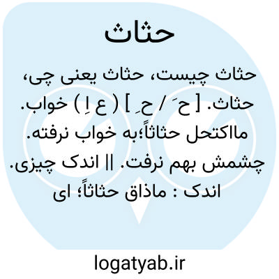 حثاث. [ ح َ / ح ِ ] ( ع اِ ) خواب. مااکتحل حثاثاً؛به خواب نرفته. چشمش بهم نرفت. || اندک چیزی. اندک: ماذاق حثاثاً؛ ای شیئاً. ( منتهی الارب ). هیچ نخورد. || کاه گاورس. ( مهذب الاسماء ).