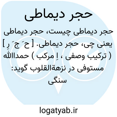 حجر دیماطی. [ ح َ ج َ رِ ] ( ترکیب وصفی، اِ مرکب ) حمداﷲ مستوفی در نزهةالقلوب گوید: سنگی است سیاه مثل لحام ( ؟ ) در دریا میباشد سوخته و با زیبق سحق کرده بر طلا نهند و بر آتش عرض کنند آبی رجراج شود.