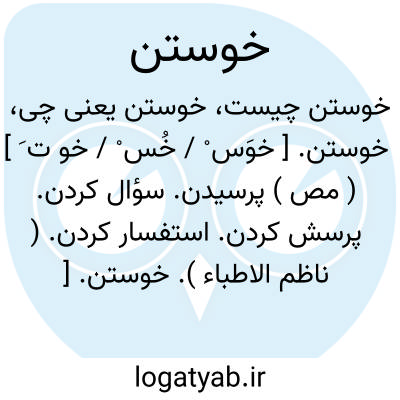 خوستن. [ خوَس ْ / خُس ْ / خو ت َ ] ( مص ) پرسیدن. سؤال کردن. پرسش کردن. استفسار کردن. ( ناظم الاطباء ).