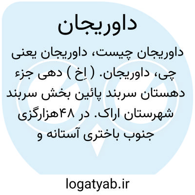 داوریجان. ( اِخ ) دهی جزء دهستان سربند پائین بخش سربند شهرستان اراک. در 48هزارگزی جنوب باختری آستانه و 27هزارگزی ایستگاه دوآب. سکنه 184 تن. آب آن از چشمه و رودخانه چوبدر تأمین میشود. محصول آن غلات و بنشن و پنبه و انگور و بادام و قلمستان. شغل اهالی زراعت و گله داری و قالیچه بافی و راه آن مالروست. ( از فرهنگ جغرافیایی ایران ج 2 ).