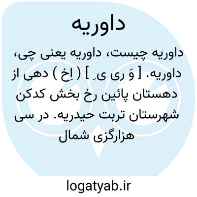 داوریه. [ وَ ری ی ِ ] ( اِخ ) دهی از دهستان پائین رخ بخش کدکن شهرستان تربت حیدریه. در سی هزارگزی شمال خاور کدکن و پنجهزارگزی شمال خاوری چینک کلاغ. دارای 110 سکنه. آب آن از قنات. محصول آن غلات و پنبه. شغل اهالی زراعت و گله داری و کرباس بافی و راه آنجا مالروست و از حصاریزدان میتوان اتومبیل برد. ( از فرهنگ جغرافیایی ایران ج 9 ).