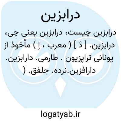 درابزین. [ دَ ] ( معرب، اِ ) مأخوذ از یونانی تراپزیون. طارمی. دارابزین. دارافزین.نرده. جلفق. ( تاج العروس ). حلفق. تفاریج. محجر و شبکه اطراف باغ و خانه. ( ناظم الاطباء ). ج، درابزینات.و رجوع به درابزینات شود: فلماتم بناؤهانقش علی دائرة الدرابزین. ( معجم البلدان ج 4 ص 68 ).