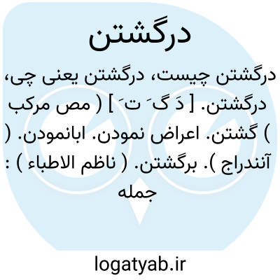 درگشتن. [ دَ گ َ ت َ ] ( مص مرکب ) گشتن. اعراض نمودن. ابانمودن. ( آنندراج ). برگشتن. ( ناظم الاطباء ): جمله مردان که به بدایت قدم او رسند همه درگردند و فروشوند و نمانند. ( تذکرةالاولیاء عطار ). || بسوی دیگر گردیدن. غلطیدن بسوی دیگر. ( یادداشت مرحوم دهخدا ). ازولال. زوال. ( منتهی الارب ): دحض، زیغ؛ درگشتن آفتاب. ( تاج المصادر بیهقی ) ( از منتهی الارب ). || پائین آمدن. نزول کردن. ( ناظم الاطباء ).