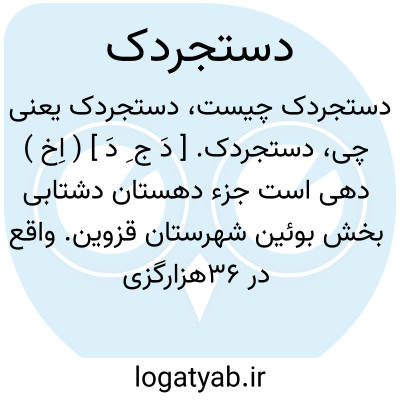 دستجردک. [ دَ ج ِ دَ ] ( اِخ ) دهی است جزء دهستان دشتابی بخش بوئین شهرستان قزوین. واقع در 36هزارگزی شمال غرب بوئین، با 121 تن سکنه ( سرشماری 1335 هَ. ش. ). آب آن از قنات و راه آن مالرو است. ( از فرهنگ جغرافیائی ایران ج 1 ). این ده را دستجرد دشتابی نیز گویند.