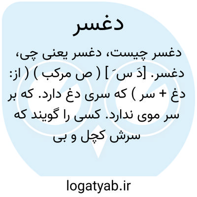 دغسر. [دَ س َ ] ( ص مرکب ) ( از: دغ + سر ) که سری دغ دارد. که بر سر موی ندارد. کسی را گویند که سرش کچل و بی موی باشد. ( برهان ). لغسر. و رجوع به لغسر شود. || آنکه پیش سرش تا فرق موی نداشته باشد. اجله. ( زمخشری ). أصلع. ( تاج المصادر بیهقی ) ( مهذب الاسماء ).