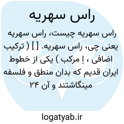 راس سهریه. [ ] ( ترکیب اضافی، اِ مرکب ) یکی از خطوط ایران قدیم که بدان منطق و فلسفه مینگاشتند و آن 24 حرف بوده و نقطه نیز داشته است. ابن ندیم در ص 21 از فهرست خود با تعریف بالا آن را در برابر راز سهریه آورده و برای آن معنی دیگر یاد کرده و مینماید که مصحف یکدیگر نیستند. رجوع به کلمه راز سهریه و راز دبیره شود.