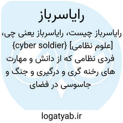 {cyber soldier} [علوم نظامی] فردی نظامی که از دانش و مهارت های رخنه گری و درگیری و جنگ و جاسوسی در فضای رایانه ای استفاده می کند