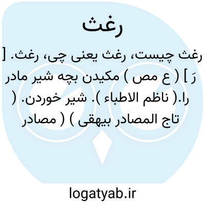رغث. [ رَ ] ( ع مص ) مکیدن بچه شیر مادر را.( ناظم الاطباء ). شیر خوردن. ( تاج المصادر بیهقی ) ( مصادر اللغه زوزنی ). بر مکیدن بزغاله شیر مادر را. ( منتهی الارب ) ( آنندراج ). || شیر دادن. ( مصادر اللغه زوزنی ). || رُغِث َ رغثاً؛ دردناک رگ پستان گردید. ( منتهی الارب ) ( ناظم الاطباء ). || ( مجهولاً ) بسیار شدن سؤال بر مرد به اندازه ای که هر چه پیش او باشد سپری شود. || نیزه بر نیزه زدن کسی را. ( منتهی الارب ) ( ناظم الاطباء ).
