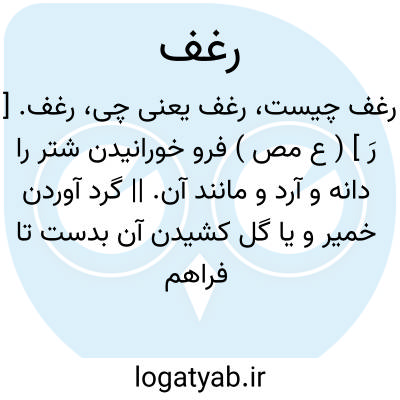 رغف. [ رَ ] ( ع مص ) فرو خورانیدن شتر را دانه و آرد و مانند آن. || گرد آوردن خمیر و یا گل کشیدن آن بدست تا فراهم آید. ( ناظم الاطباء ) ( آنندراج ) ( منتهی الارب ).