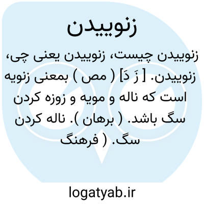 زنوییدن. [ زَ دَ] ( مص ) بمعنی زنویه است که ناله و مویه و زوزه کردن سگ باشد. ( برهان ). ناله کردن سگ. ( فرهنگ رشیدی ). ناله کردن سگ. زوزه کشیدن سگ. ( فرهنگ فارسی معین ). زنویه. ( آنندراج ). زوزه کشیدن سگ. ( ناظم الاطباء ): هریر؛زنوییدن. ( یادداشت بخط مرحوم دهخدا ). || مویه و ناله کردن. || ولوله کردن. || شخولیدن. ( ناظم الاطباء ). رجوع به زنویه شود.