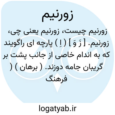 زورنیم. [ زَ وَ ] ( اِ ) پارچه ای راگویند که به اندام خاصی از جانب پشت بر گریبان جامه دوزند. ( برهان ) ( فرهنگ فارسی معین ). پارچه ای بود که بر گریبان جامه از جانب پشت دوزند به جهت خوشایندگی و آنرا به ترکی الپاق خوانند. ( جهانگیری ) ( از فرهنگ رشیدی ) ( از انجمن آرا ) ( از آنندراج ). || پینه و وصله جامه. || تکه ای که برای فراخ کردن جامه در میان آن مندرج کنند. ( ناظم الاطباء ).