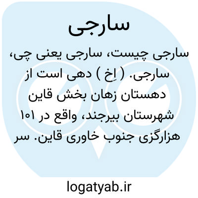 سارجی. ( اِخ ) دهی است از دهستان زهان بخش قاین شهرستان بیرجند، واقع در 101 هزارگزی جنوب خاوری قاین. سر راه اتومبیل رو اسفدن به باسفج. کوهستانی ومعتدل، و آب آن از قنات، و محصول آن غلات و شلغم است، 150 تن سکنه دارد که به زراعت و مالداری اشتغال دارند. از صنایع دستی قالیچه بافی در آن معمول است. راه اتومبیل رو دارد. ( از فرهنگ جغرافیائی ایران ج 9 ).