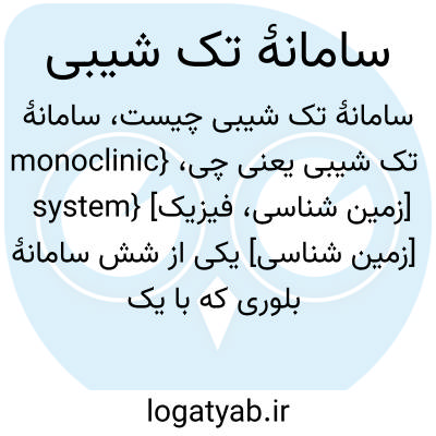 {monoclinic system} [زمین شناسی، فیزیک] [زمین شناسی] یکی از شش سامانۀ بلوری که با یک محور دوتایه (twofold axis ) یا یک صفحۀ تقارن یا ترکیبی از آنها مشخص می شود [فیزیک] سامانه ای بلوری که محورهای خانک واحد آن طول های نابرابر دارند، درحالی که زاویۀ بین دو محور هر مقدار د...
