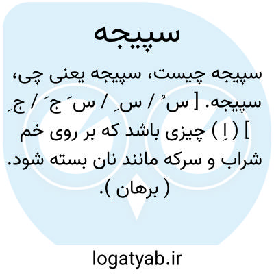 سپیجه. [ س ُ / س ِ / س َ ج َ / ج ِ ] ( اِ ) چیزی باشد که بر روی خم شراب و سرکه مانند نان بسته شود. ( برهان ). آنچه بر روی سرکه و شراب بسته شود، مانند قیماق. ( رشیدی ). رجوع به سپیچه شود: قَمْحة؛ سپیجه که بر شراب افتد. ( منتهی الارب ).