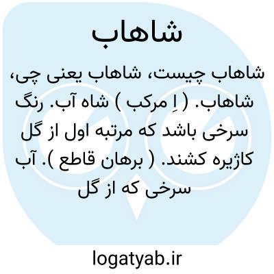 شاهاب. ( اِ مرکب ) شاه آب. رنگ سرخی باشد که مرتبه اول از گل کاژیره کشند. ( برهان قاطع ). آب سرخی که از گل کاجره حاصل شود بعد از زردآب. ( انجمن آرا ) ( آنندراج ). رنگ سرخی که از عصیر کازیره سازند. ( ناظم الاطباء ). شاه آبه. آب سرخی که از گل کاجیره گیرند بعد از آب زرد برای رنگ. ( فرهنگ نظام ). شاهابه. آب سرخ که ازگل کاجره حاصل شود بعد از زردآب. ( فرهنگ رشیدی ). رنگ سرخ. ( ناظم الاطباء ). || سرآب. مقابل پس آب. آب اول که گیرند از چیزی مانند انگور و جز آن. ( یادداشت مؤلف ). آب اول که از گل در عرق کشی گیرند و غیره. ( یادداشت مؤلف ). آب یا عرق اول که از گیاهی معطر یا دوایی یا میوه گیرند. ( یادداشت مؤلف ). آب مستخرج از معصر است بطریق خاص. ( یادداشت مؤلف ). آب پرمایه تر که بار اول از چیزی گیرند. ( یادداشت مؤلف ).