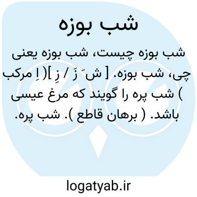 شب بوزه. [ ش َ زَ / زِ ]( اِ مرکب ) شب پره را گویند که مرغ عیسی باشد. ( برهان قاطع ). شب پره. خفاش. وطواط. ( ناظم الاطباء ). ظاهراً مصحف شب یوزه و شب یازه است. ( حاشیه برهان چ معین ).