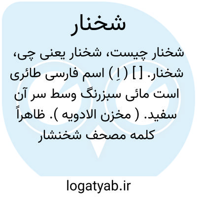 شخنار. [ ] ( اِ ) اسم فارسی طائری است مائی سبزرنگ وسط سر آن سفید. ( مخزن الادویه ). ظاهراً کلمه مصحف شخنشار ( خشنسار ) باشد.