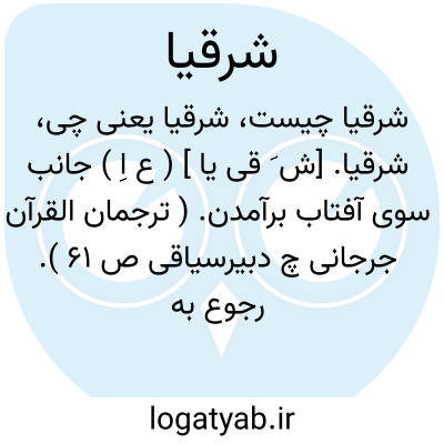 شرقیا. [ش َ قی یا ] ( ع اِ ) جانب سوی آفتاب برآمدن. ( ترجمان القرآن جرجانی چ دبیرسیاقی ص 61 ). رجوع به شرق شود.