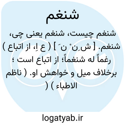 شنغم. [ ش ِن ْ ن َ ] ( ع اِ، از اتباع ) رغماً له شنغماً؛ از اتباع است؛ برخلاف میل و خواهش او. ( ناظم الاطباء ) ( از منتهی الارب ) ( از اقرب الموارد ). و رجوع به سنغم شود.