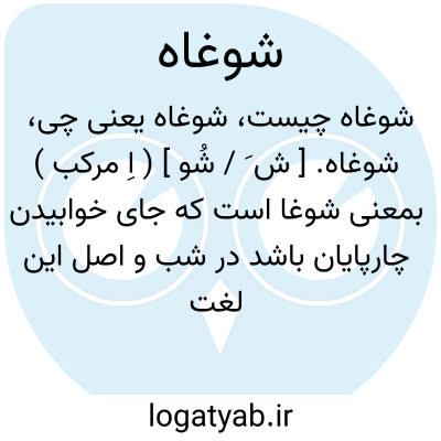 شوغاه. [ ش َ / شُو ] ( اِ مرکب ) بمعنی شوغا است که جای خوابیدن چارپایان باشد در شب و اصل این لغت شبگاه بود و چون در کلام فارسی بای ابجد به واو و گاف فارسی به غین تبدیل می یابند شبگاه شوغاه شده. ( برهان ) ( از فرهنگ جهانگیری ). حظیره که اشتر را سازند. خفتنگاه گوسفند و جز آن. ( یادداشت مؤلف ): الزرب؛ شوغاه ساختن. الاکتناف؛ گرد چیزی برآمدن و شوغاه ببافتن شتر را از شاخ درخت. ( تاج المصادر بیهقی ). و رجوع به مترادفات کلمه شود.