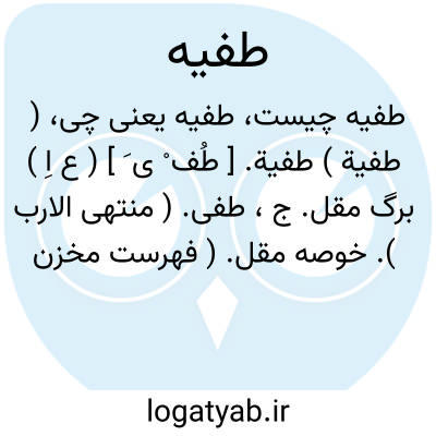 ( طفیة ) طفیة. [ طُف ْ ی َ ] ( ع اِ ) برگ مقل. ج، طفی. ( منتهی الارب ). خوصه مقل. ( فهرست مخزن الادویه ). اسلم. شاخه های مقل. || ماری است خبیث که بر پشت دو خط سپید دارد مانند دو برگ مقل و منه الحدیث: اقتلوا ذوالطفیتین. ( منتهی الارب ).