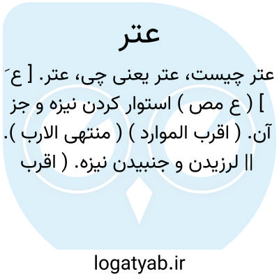 عتر. [ ع ِ ] ( ع اِ ) اصل و در مثل است عادت بعترها. در حق شخصی گویند که به سوی خلق قدیم خود بازگردد، عادت الی عترها؛ یعنی به اصل خود بازگشت در حق کسی گویند که بخوی واگذاشته بازگردد. || گیاهی است که پراکنده روید، یا از درختان خرد است. رستنی است مانند مرزنجوش که بدان مداوا کنندو گفته اند درختان خرد است. || نره. || بت. ( منتهی الارب ). بت که برای آن قربانی کنند. ( اقرب الموارد ). || ذبیحه. || هرچه ذبح شود. ( منتهی الارب ). گویند که در جاهلیت در ماه رجب جهت خدایان خود میکشتند. ( اقرب الموارد ). || دسته بیل و جز آن. یا چوب پهن که بیل آهن دوزند و پای بر او نهند وقت زمین کندن. || ( مص ) بیهوده گفتن. ( اقرب الموارد ) ( آنندراج ).