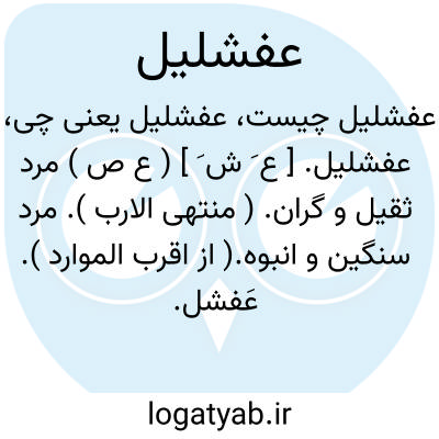عفشلیل. [ ع َ ش َ ] ( ع ص ) مرد ثقیل و گران. ( منتهی الارب ). مرد سنگین و انبوه.( از اقرب الموارد ). عَفشل. و رجوع به عفشل شود. || درشت خوی. ( منتهی الارب ). جافی و ثقیل. ( اقرب الموارد ). || گنده پیر فروهشته گوشت. ( منتهی الارب ). عجوز سست گوشت. ( از اقرب الموارد ). || گلیم بسیارپشم. ( منتهی الارب ). کساء سطبر و خشک وبسیارپشم. ( از اقرب الموارد ). || ( اِ ) کفتار، یا کفتار نر. ( منتهی الارب ) ( از اقرب الموارد ).