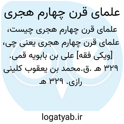 [ویکی فقه] علی بن بابویه قمی. ۳۲۹ هـ.ق.محمد بن یعقوب کلینی رازی. ۳۲۹ هـ.ق.شیخ محمد کشی. ۳۳۰ هـ.ق.ابن ابی عقیل عمانی. نیمه اول قرن ۴.علی بن حسین مسعودی. ۳۴۶ هـ.ق.ابوالقاسم علی بن محمد بن علی خزاز قمی رازی. نیمه دوم قرن ۴.ابن قولویه قمی. ۳۶۷ هـ. ق.عیاشی سمرقندی. ۳۶۸ هـ. ق.ابن جنید اسکافی. ۳۸۱ هـ. ق.ابن شعبه حرانی. زنده در ۳۸۱ هـ. ق.صاحب بن عباد. ۳۸۵ هـ. ق.ابو علی محمد بن اشعث کوفی (زنده در ۳۱۳ هـ. ق.)محمد بن علی بن بابویه معروف به شیخ صدوق. م ۳۸۱ هـ. ق.