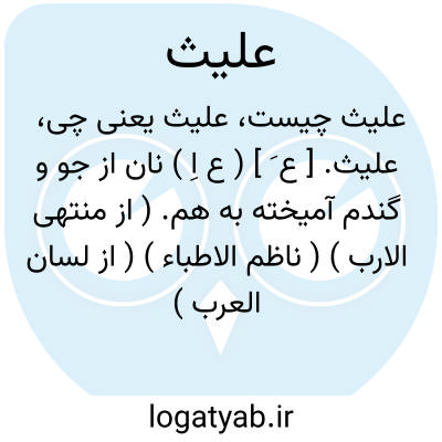 علیث. [ ع َ ] ( ع اِ ) نان از جو و گندم آمیخته به هم. ( از منتهی الارب ) ( ناظم الاطباء ) ( از لسان العرب ) ( ازتاج العروس ) ( از اقرب الموارد ) ( از متن اللغة ). این لغت به صورت «غَلیث » با غین نیز آمده است. ( از لسان العرب ) ( از تاج العروس ). و نیز رجوع به غلیث شود.