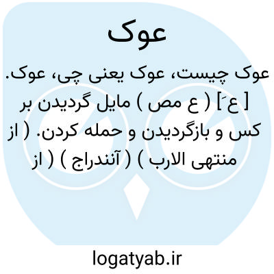 عوک. [ ع َ] ( ع مص ) مایل گردیدن بر کس و بازگردیدن و حمله کردن. ( از منتهی الارب ) ( آنندراج ) ( از ناظم الاطباء ). مایل شدن و حمله کردن بر کسی. || روی آوردن وپیش آمدن. ( از اقرب الموارد ). پیش آمدن. ( منتهی الارب ). || به خانه برگشتن زن و خوردن آنچه درآن باشد. ( از منتهی الارب ) ( از آنندراج ) ( از ناظم الاطباء ) ( از اقرب الموارد ). || ورزیدن معاش خود را. ( از منتهی الارب ) ( آنندراج ). ورزیدن و کسب کردن معاش. ( ناظم الاطباء ). کسب کردن. ( از اقرب الموارد ). مَعاک. رجوع به معاک شود. || پناه بردن به کسی. ( از منتهی الارب ) ( از آنندراج ) ( از ناظم الاطباء ) ( از اقرب الموارد ). || امیدوار ساختن بر مال. ( از منتهی الارب ) ( آنندراج ). امیدوار گردیدن بر مال خود. ( از ناظم الاطباء ) ( از اقرب الموارد ).