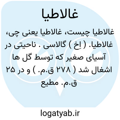 غالاطیا. ( اِخ ) گالاسی. ناحیتی در آسیای صغیر که توسط گل ها اشغال شد ( 278 ق.م. ) و در 25 ق.م. مطیع رومیان گردید: والنبات الذی ینبت بقیادوقا ( قبادوقیا ) و بالبلاد التی یقال لها عالاطیا ( غالاطیا ) التی به آسیا... ( ابن البیطار: حرمل ) تکون ( زبد البحیرة ) بالبلاد التی یقال لها عالاطیا ( غالاطیا ) و هی بلاد الافرنج ( ابن البیطار: زبدالبحیرة ) و رجوع به ابن البیطار ذیل اسطوخودوس و به ترجمه لکلرک ( همین مورد ) شود.