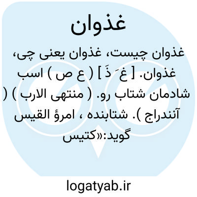 غذوان. [ غ َ ذَ ] ( ع ص ) اسب شادمان شتاب رو. ( منتهی الارب ) ( آنندراج ). شتابنده، امرؤ القیس گوید:«کتیس ظباء الحلب الغذوان ». ( معجم البلدان ). || مرد درشت و زبان دراز و نافرمان و تیزرو. ( منتهی الارب ) ( آنندراج ). الغذوان من الرجال السلیط الفاحش. تأنیث آن غذوانة. ( اقرب الموارد ) ( تاج العروس ).