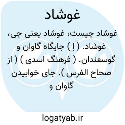 کند شبان به شبان از پی گله غوشاد.شمس فخری ( از آنندراج ) ( جهانگیری ).|| سرگین سایر حیوانات. بفتح اول نیز آمده است. سرگین حیوانات. غوشا. || جای فرودآمدن کاروان. قافله گاه. ( از برهان قاطع ). || جایگاه دیوان و جنیان. ( اداة الفضلاء ) ( برهان قاطع ) ( ناظم الاطباء ). || درخت بلند. ( برهان قاطع ) ( اداة الفضلاء ).