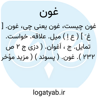غون. [ غ َ ] ( ع اِ ) میل. علاقه. خواست. تمایل. ج، اَغوان. ( دزی ج 2 ص 232 ).