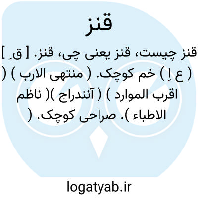 قنز. [ ق ِ ] ( ع اِ ) خم کوچک. ( منتهی الارب ) ( اقرب الموارد ) ( آنندراج )( ناظم الاطباء ). صراحی کوچک. ( ناظم الاطباء ) ( آنندراج ). اِقنیز. ( منتهی الارب ). || ( ص ) مرد پاک از آلایش و دنس. ( منتهی الارب ) ( اقرب الموارد ) ( ناظم الاطباء ) ( آنندراج ). و به ضم نیز آید. ( منتهی الارب ).