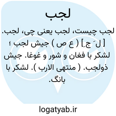 لجب. [ ل َ ج ِ] ( ع ص ) جیش لجب؛ لشکر با فغان و شور و غوغا. جیش ذولجب. ( منتهی الارب ). لشکر با بانگ. ( مهذب الاسماء ).