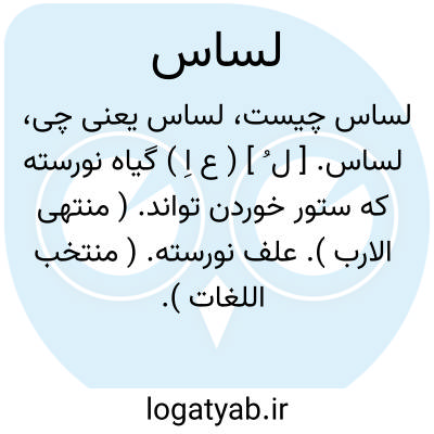 لساس. [ ل ُ ] ( ع اِ ) گیاه نورسته که ستور خوردن تواند. ( منتهی الارب ). علف نورسته. ( منتخب اللغات ). || گیاهی است سخت و درشت شبیه گاوزبان ( یا آن لُساس است کزنار و لیست به دواء من اوجاع السنةالناس و الابل و ینفع من الخفقان و حرارة المعدة و القلاع و ادواءالفم ). ( منتهی الارب ). نباتی است. ( مهذب الاسماء ).