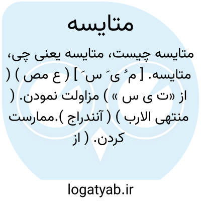 متایسه. [ م ُ ی َ س َ ] ( ع مص ) ( از «ت ی س » ) مزاولت نمودن. ( منتهی الارب ) ( آنندراج ).ممارست کردن. ( از ذیل اقرب الموارد ). تایس متایسة وتیاساً؛ ممارست کرد آن را و مزاولت نمود. ( ناظم الاطباء ). || مکابست نمودن. ( منتهی الارب ) ( آنندراج ). || مدافعت نمودن. ( منتهی الارب ) ( آنندراج ) ( ناظم الاطباء ). || با هم چیرگی کردن در زیرکی. || رد کردن. ( ناظم الاطباء ).