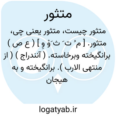 متثور. [ م ُ ت َ ث َوْ وِ ] ( ع ص ) برانگیخته وبرخاسته. ( آنندراج ) ( از منتهی الارب ). برانگیخته و به هیجان آمده. ( ناظم الاطباء ). و رجوع به تثور شود.
