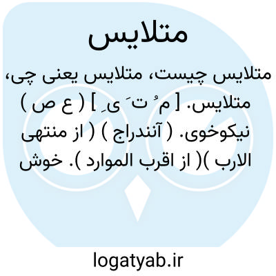 متلایس. [ م ُ ت َ ی ِ ] ( ع ص ) نیکوخوی. ( آنندراج ) ( از منتهی الارب )( از اقرب الموارد ). خوش خوی. ( ناظم الاطباء ). || اغماض کننده و اغماض کرده. ( ناظم الاطباء ) ( از منتهی الارب ) ( از اقرب الموارد ). رجوع به تلایس شود.