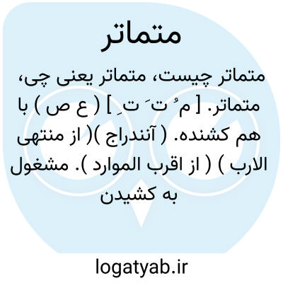متماتر. [ م ُ ت َ ت ِ ] ( ع ص ) با هم کشنده. ( آنندراج )( از منتهی الارب ) ( از اقرب الموارد ). مشغول به کشیدن این طرف و آن طرف. ( ناظم الاطباء ). || آتش که پی در پی فروریزد از آتش زنه. ( آنندراج ) ( از منتهی الارب ) ( از اقرب الموارد ). اخگرهایی که از آتش، اینجا و آنجا پرد. ( ناظم الاطباء ). رجوع به تماتر شود.