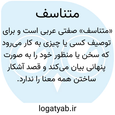 «متناسف» صفتی عربی است و در زبان عربی و فارسی برای توصیف کسی یا چیزی به کار میرود که سخن یا منظور خود را به صورت پنهانی بیان میکند و قصد آشکار ساختن همه معنا را ندارد. «متناسف» در متون لغوی به معنای پنهان سخنگوینده، رازگو یا کسی که به طور مخفیانه مطلبی را بیان میکند، آمده است. کاربرد «متناسف» در متون تاریخی و دینی نیز دیده میشود و برای توصیف فردی که سخنش با دقت و پوشیدگی همراه است، استفاده شده است. این صفت میتواند به معنای محافظت از رازها یا بیان محتاطانه امور نیز باشد، به گونهای که شنونده تنها بخشی از حقیقت را دریافت کند.